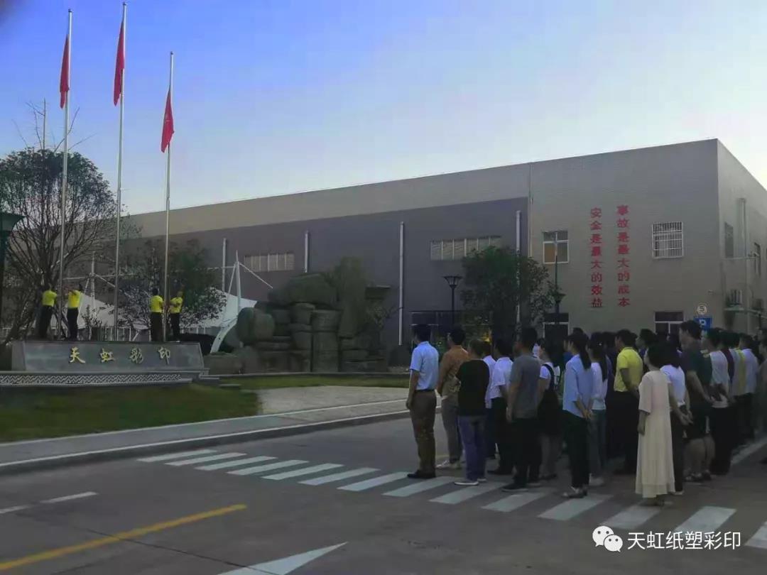 金秋十月,普天同慶。9月30日,在國慶節(jié)到來之際,武漢市天虹紙塑彩印有限公司隆重舉行升旗儀式,慶祝新中國成立70周年。上午7時(shí)30分,伴隨著莊嚴(yán)的國歌聲,鮮艷的五星紅旗冉冉升起,迎風(fēng)飄揚(yáng)。天虹員工精神抖擻,莊嚴(yán)肅立,面向國旗行注目禮,向偉大祖國致以崇高敬意和美好祝福,公司員工代表110人參加了升旗儀式。