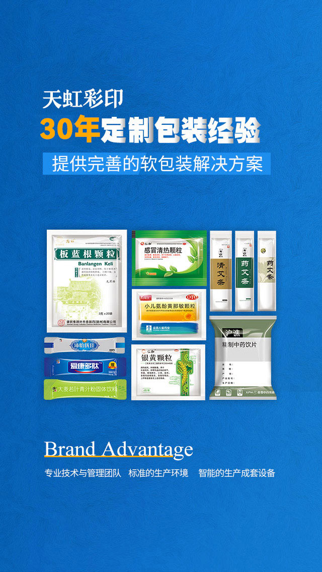 武漢市天虹紙塑彩印有限公司成立于1994年8月18日,是一家集設(shè)計(jì),印刷,制作于一體的塑料軟包裝高新技術(shù)企業(yè),公司坐落于武漢市蔡甸經(jīng)濟(jì)開(kāi)發(fā)區(qū),占地面積33000平方米。公司總投資1.5億元,新建了高于國(guó)家D級(jí)標(biāo)準(zhǔn)的無(wú)菌車間,并在國(guó)家藥品監(jiān)督管理局注冊(cè)登記了12個(gè)不同材質(zhì)結(jié)構(gòu)的藥包材生產(chǎn)許可證...